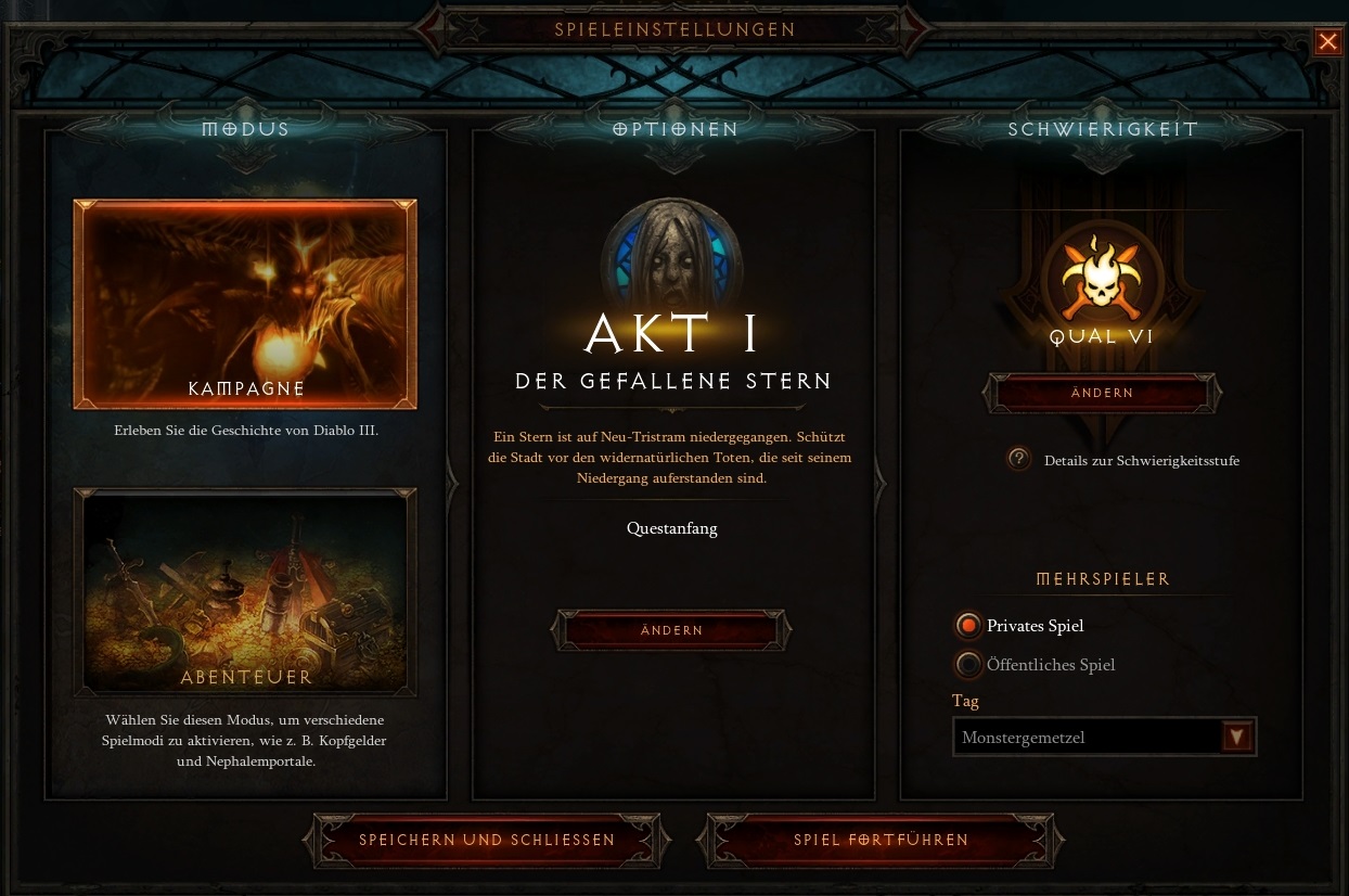 Der mittlere Teil des Einstellungsfensters ist nur in der Kampagne interessant. Hier wird die Quest ausgewählt, die du spielen willst. Seit es den Abenteuermodus gibt, hat diese Funktion mehr oder weniger keine Bedeutung mehr. Nur früher hat man hier regelmäßig die Quest geändert, um z.B. mehrfach hintereinander einige Bosse zu killen. Beim ersten Durchspielen braucht man das eigentlich nicht, und danach spielt man nur im Abenteuermodus.