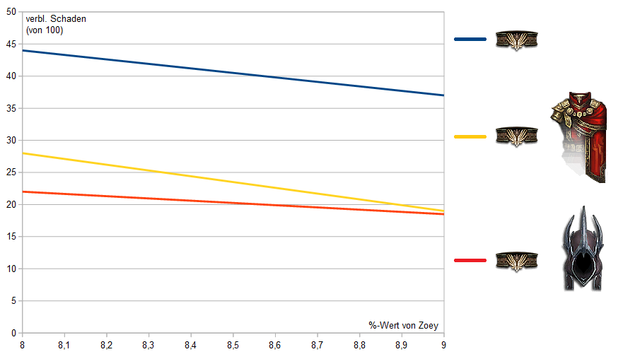 Als der Gürtel eingeführt wurde, wurde man mit Garwulf im Würfel zunächst nur belächelt. Aber es hat sich doch schnell die Erkenntnis durchgesetzt, dass bei einem guten Zoey sich auch die rechnerische Zähigkeit durch Garwulf nur unwesentlich von Gunes unterscheidet, und die positiven Effekte zweier zusätzlicher Wölfe das mehr als ausbügeln. Der Unterschied im verbleibenden Schaden zwischen Gunes und Garwulf bei den möglichen Werten für Zoeys Geheimnis kann in der Grafik abgelesen werden.