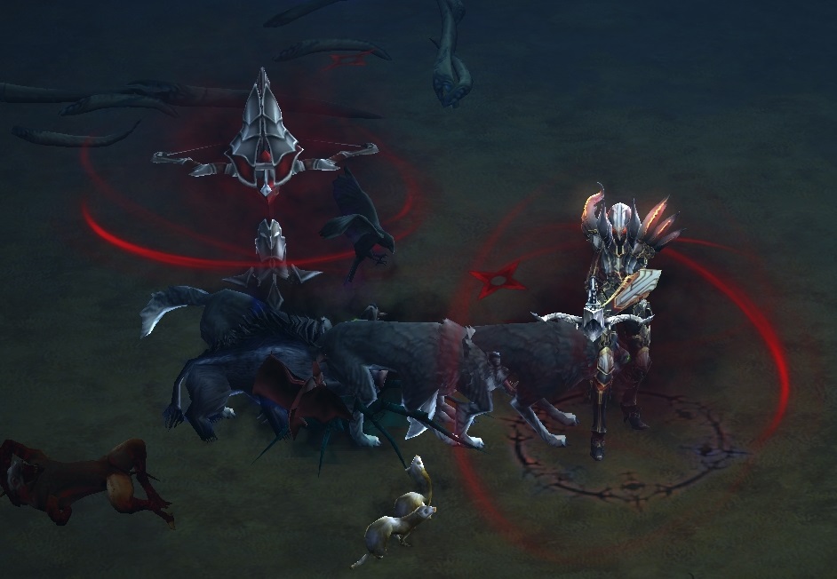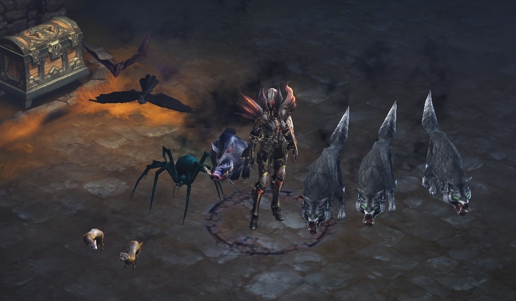 Beim Tragen von zwei Teilen werden bei Verwendung der Fertigkeit “Gefährte” alle Gefährten herbeigerufen. Also Rabe, Spinne, Fledermaus, Eber, zwei Frettchen und der Wolf. Wird außerdem der Umhang des Garwulf getragen, zwei weitere Wölfe (also insgesamt drei). Wir erhalten dabei alle passiven Boni unserer Gefährten (also Hassregeneration, Widerstände, Leben pro Sekunde, Bewegungsgeschwindigkeit und Goldbonus), und beim aktivieren der Fertigkeit auch alle aktiven Effekte.