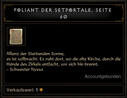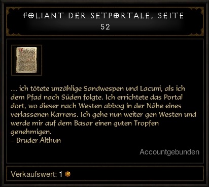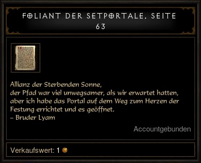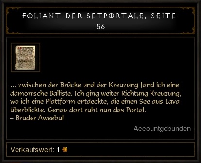 In dem seit Patch 2.4 erweiterten Gebiet "Leorics Anwesen" findet man jetzt einen Raum, der an eine Bücherei erinnert, und dort einen Schriftenständer. Geht man mit einem angelegten Set zu diesem Schriftenständer, dann findet man dort eine Seite mit Hinweisen zu dem jeweiligen Set. Mit ein wenig Kenntnis der Gebiete kann man so das Portal recht schnell finden.