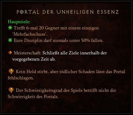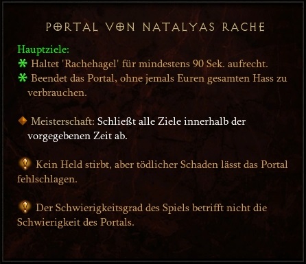 Nach den letzten sehr starken Buffs für Natalya ist vielleicht noch der Tipp sinnvoll, etwas Schaden abzubauen, oder zumindest gemütlich durch das Portal zu laufen, und nicht zu hetzen. Sonst kann es vorkommen, dass man alle Gegner besiegt hat, bevor die 90 Sekunden Dauer-Rachehagel vorbei sind - und dann scheitert man zwangsweise.