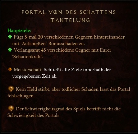 45 Gegner mit Schattenkraft verlangsamen und 5x20 Gegner in Folge Aufspießen.